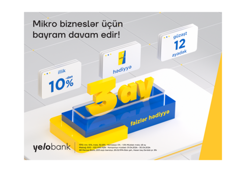 Bayram bitsə də, "Yelo Bank" ASC-də fürsətlər davam edir! Bankın bu dəfəki kampaniyası ilə sahibkarlara mikro bizneslərini gücləndirmək çox rahat olacaq. Belə ki, aprel ayı ərzində minimum 12 aydan başlayan müddətə götürən sahibkarlara kreditin son 3 aylıq faiz ödənişləri hədiyyə olunacaq. Kreditin maksimal məbləği 100 000 manat təşkil edir. Ödənişinizi daha da asanlaşdırmaq üçün Bank 12 aylıq güzəşt müddəti də verir. Bununla yanaşı, kredit əldə edəcək sahibkarlara "Yelo" biznes kartı hədiyyə edilir.